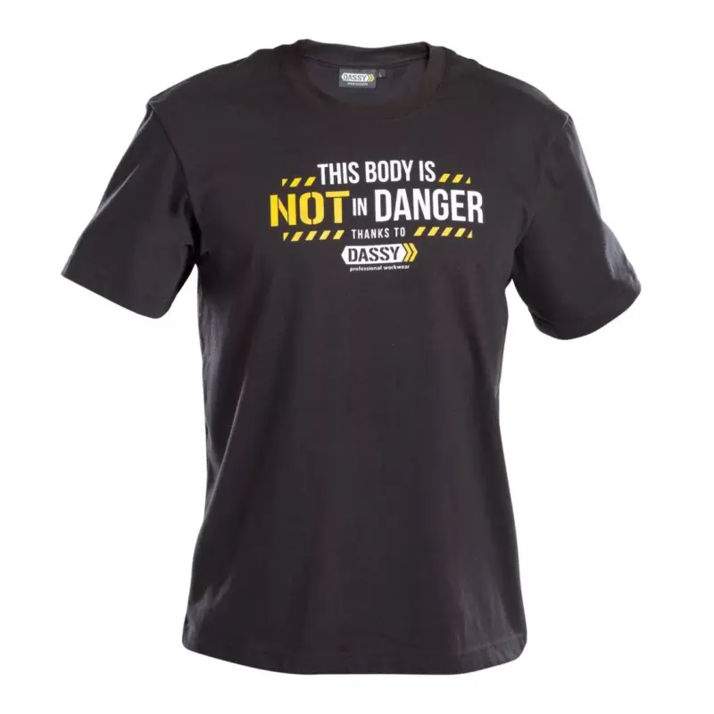Robustes und komfortables Rundhals-T-Shirt mit Slogan “This body is not in danger thanks to DASSY”.