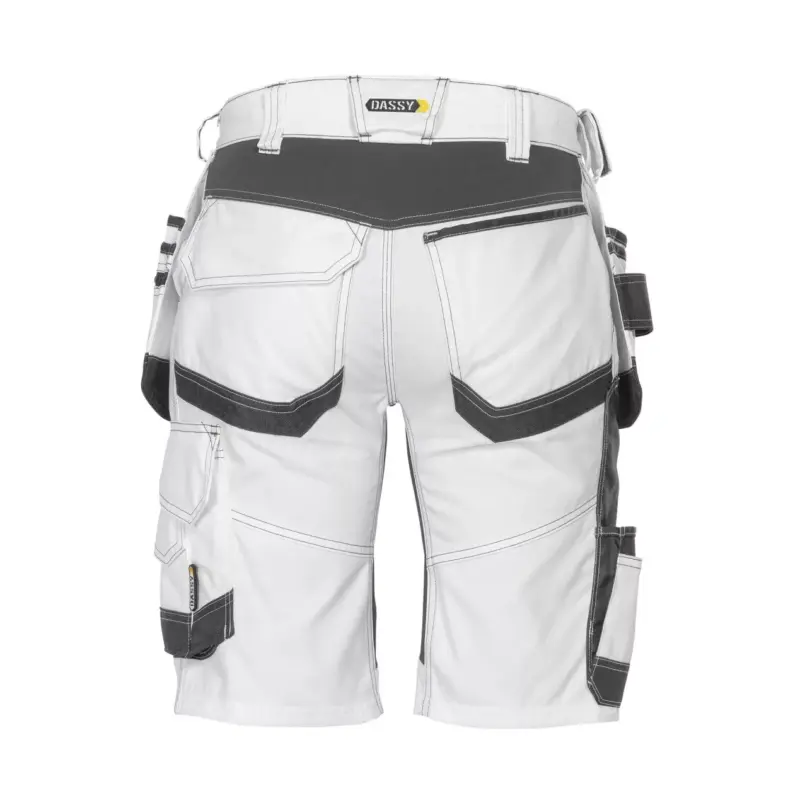 Dassy Trix moderne Herren Shorts. Mit diesen Holstertaschen-Malershorts mit Stretch können Maler und Stuckateure jede Arbeitssituation meistern. Die zahlreichen Taschen, sowie die spezielle Schenkeltasche für Malerwerkzeuge, sind leicht zugänglich und mit Cordura® verstärkt. Und die Stretch-Einsätze? Die bieten Ihnen eine zusätzliche Elastizität , genau dort, wo Sie es brauchen.