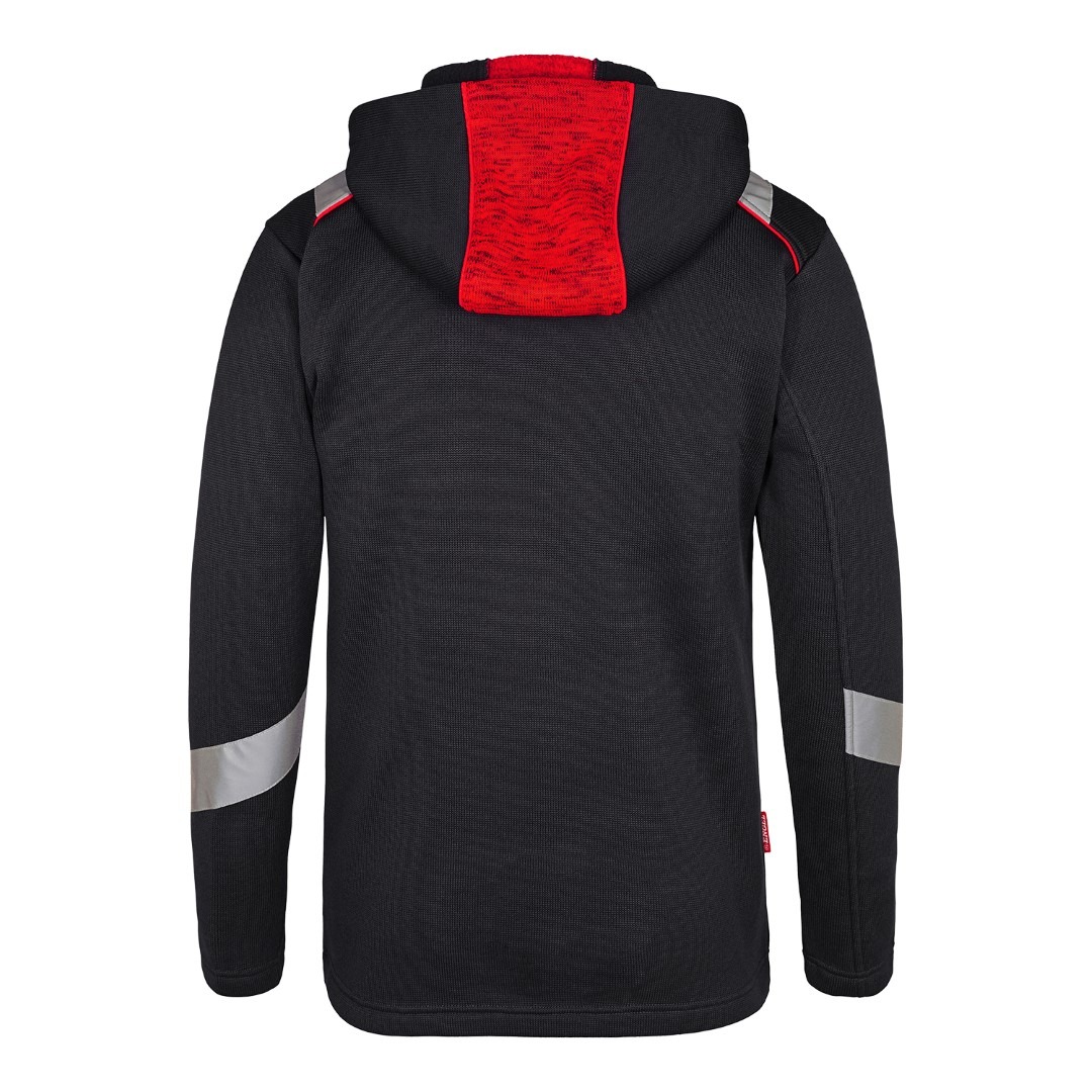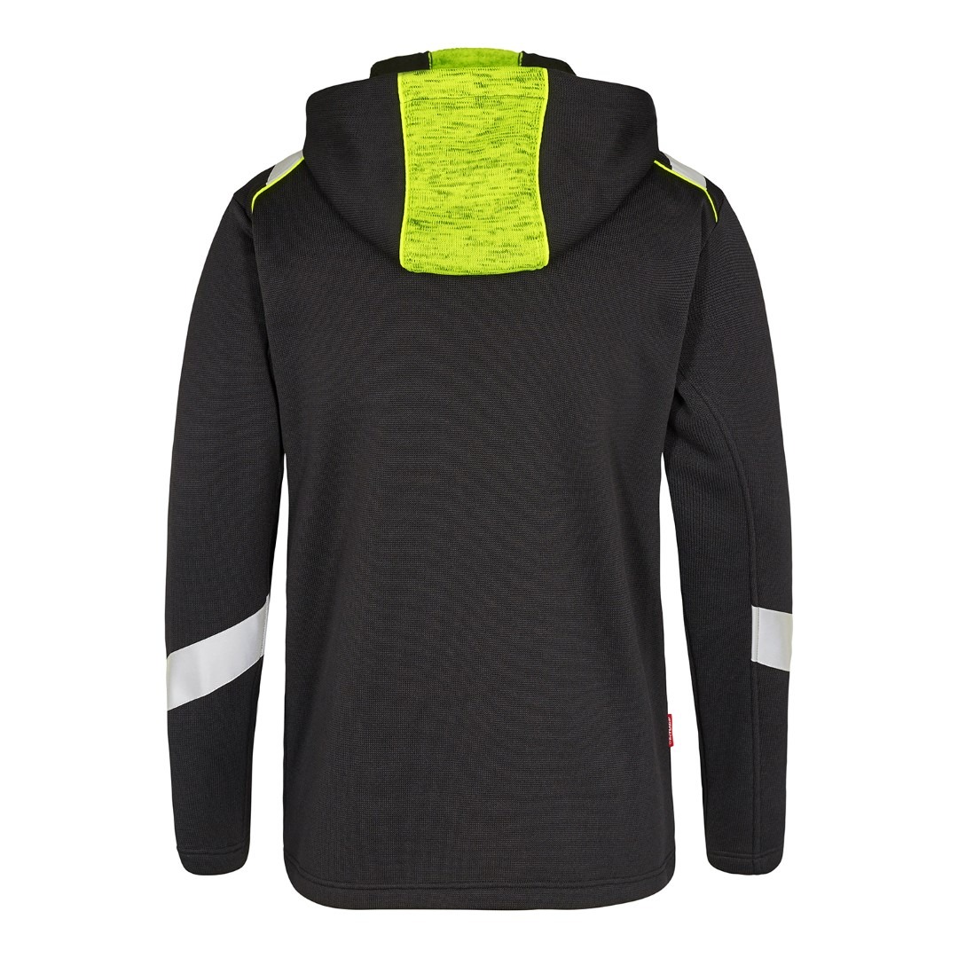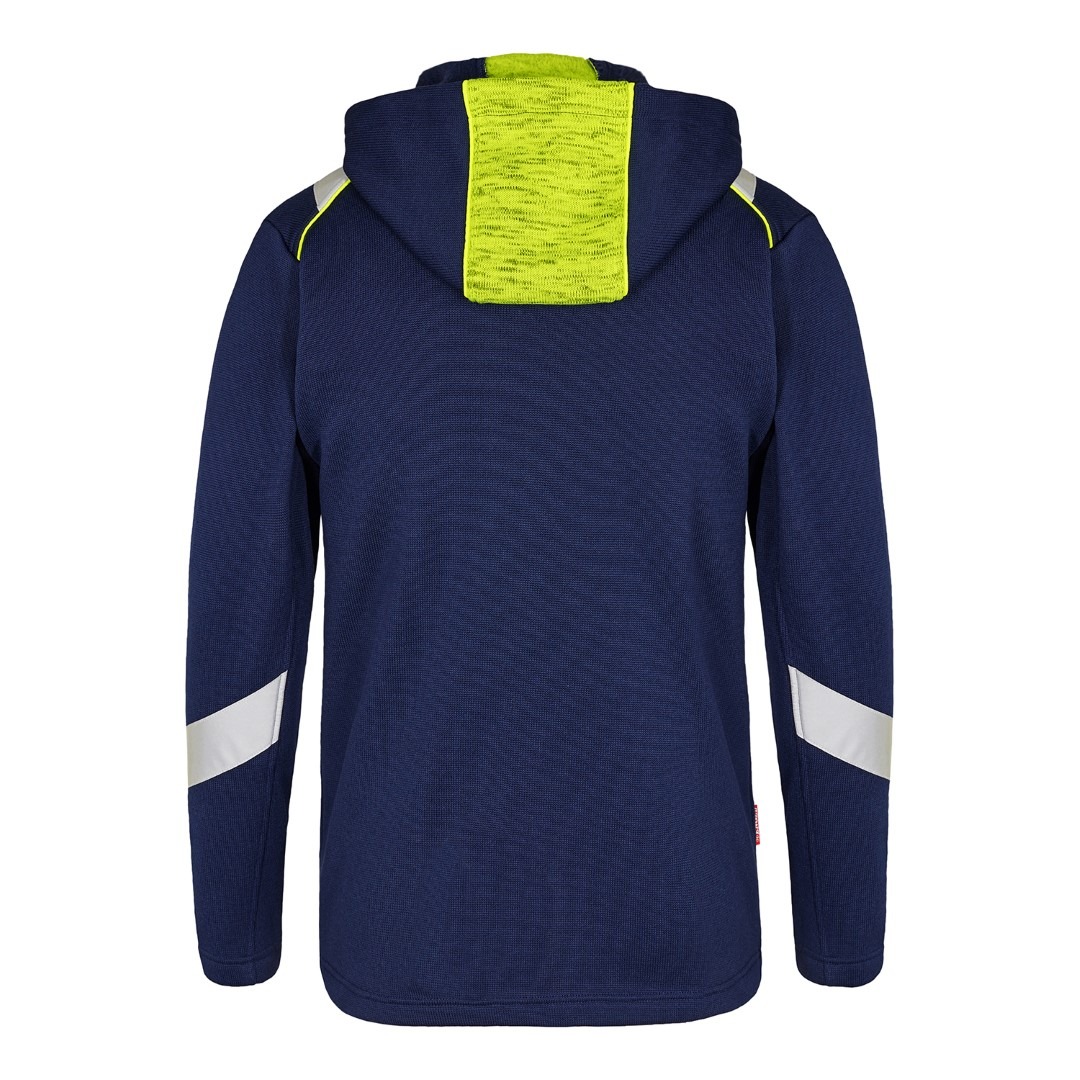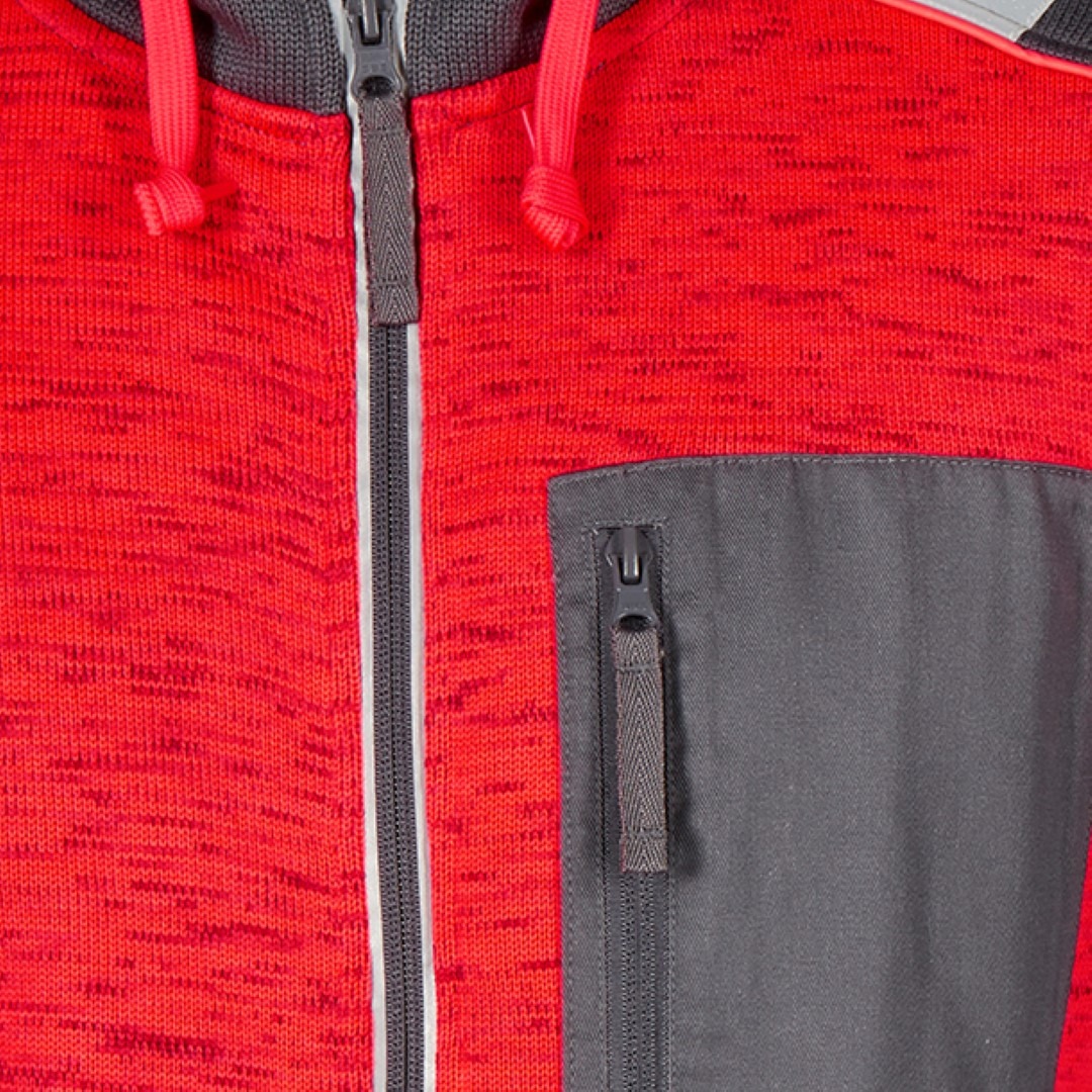 Cardigan aus weichem Strickstoff mit Fleece auf der Rückseite. Reißverschluss mit Reflex an der Vorderseite. Zwei geräumige Einschubtaschen und Brusttasche, alle mit Reißverschluss. Kapuze mit Schnüren. Reflexdetails für erhöhte Sichtbarkeit und ist somit eine ausgezeichnete Wahl für Fahrer, Servicemitarbeiter, Lagermitarbeiter und Spediteure, die Wert auf Sicherheit und Komfort legen.