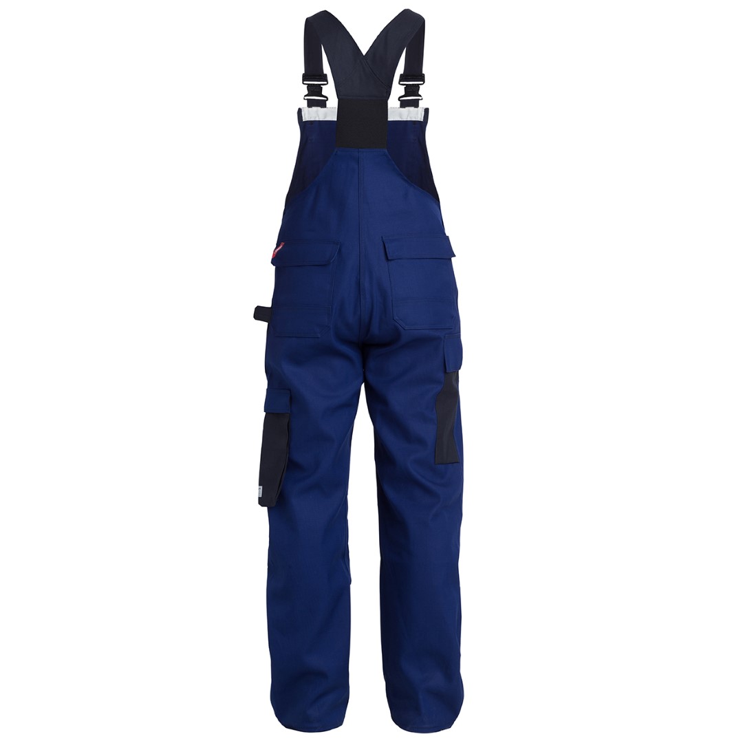 Latzhose mit Brusttasche mit Reißverschluss, zwei mit Patte verdeckte Einschubtaschen, verstärkte Gesäßtaschen mit Patte, Hammerschlaufe, Zollstocktasche, Knieverstärkung/Knietaschen mit Klettverschluss unten. Funktionelle Details bei Taschen und Bund verhindern das Festsetzen der Funken. Antistatisch, flammhemmend und schützend vor Aerosolen, Spray und leichten Spritzern von Chemikalien.