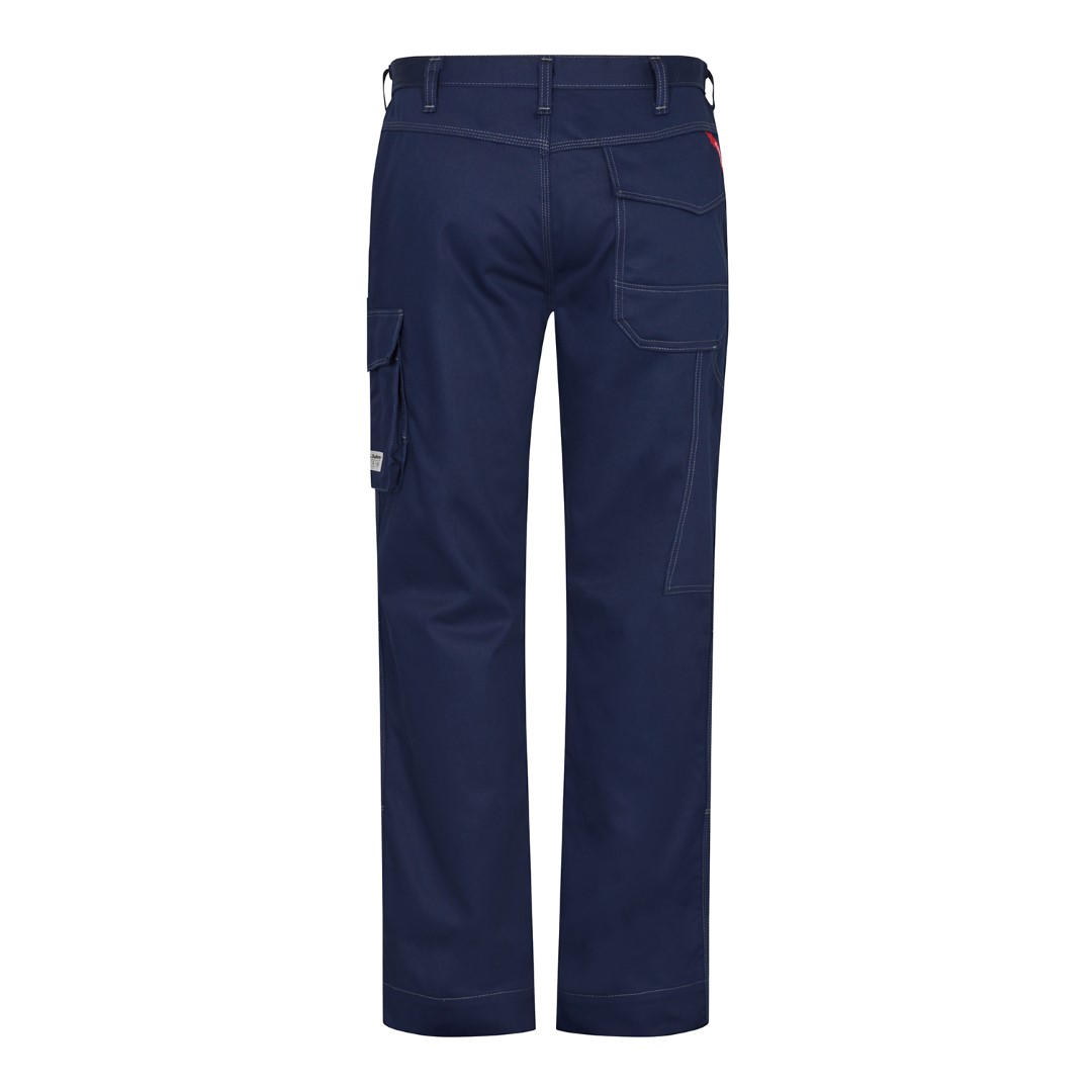 Flammhemmende Hose mit Einschubtaschen. Verstärkte Gesäßtasche mit Patte. Zollstocktasche mit Patte. Geräumige Schenkeltasche. Darüber hinaus freihängende Schenkeltasche für mehr Bewegungsfreiheit. Knieverstärkung/Knietasche mit Klettverschluss unten sowie zwei Einstellmöglichkeiten für Knieschutzkissen. Für Industriewäsche geeignet.