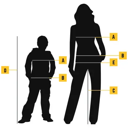 Perfekt sitzende Arbeitskleidung ist nicht nur komfortabel und funktionell, sondern macht Ihren Job auch sicherer! Messen Sie Ihre Größe anhand der Zeichnung, am besten direkt auf der Haut. Das Maßband sollte dabei gut anliegen, ohne einzuschneiden.