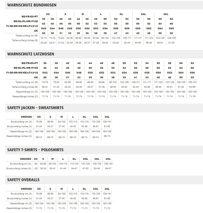 GRÖSSENTABELLE SAFETY WORKWEAR