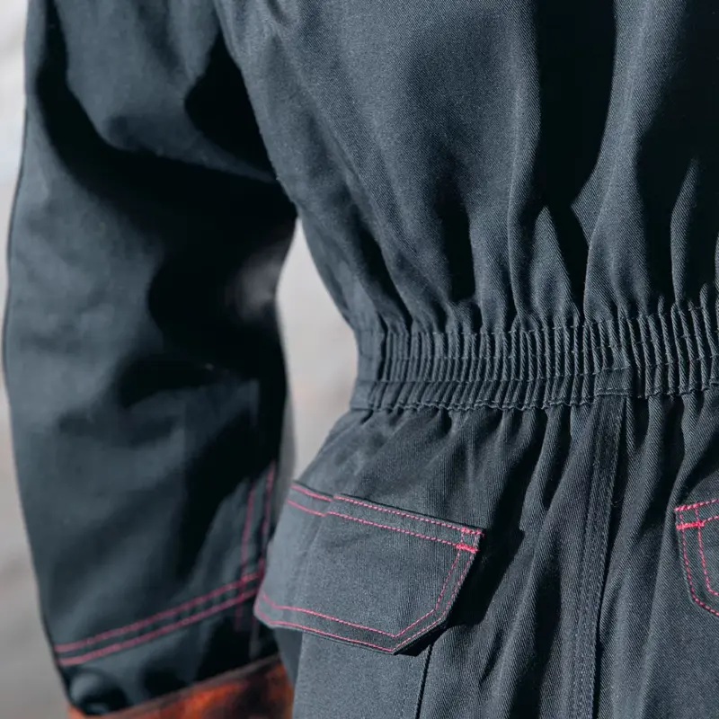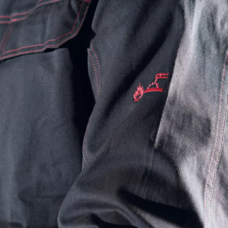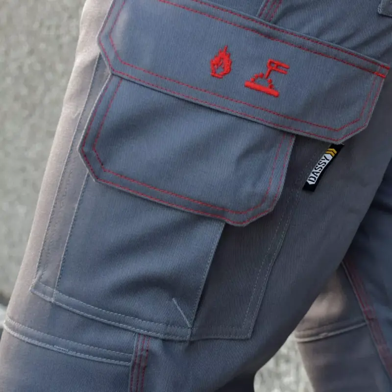 Die flammhemmende Arbeitskleidung von DASSY wurde nicht nur flammhemmend behandelt, sondern erfüllt ebenfalls alle Designanforderungen von Arbeitskleidung dieser Art. So sind beispielsweise alle Taschen zum Schutz vor Funken mit Klappen abgedeckt und in einem bestimmten Winkel angebracht. Des Weiteren sind auch alle Metallkomponenten (z.B. Druckknöpfe, Reißverschlüsse) auf der Innen- und Außenseite abgedeckt, um so Wärmeleitung zu verhindern.