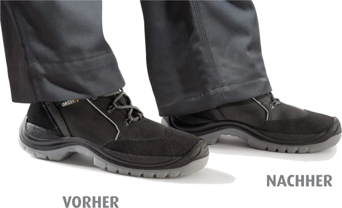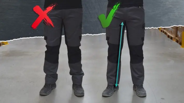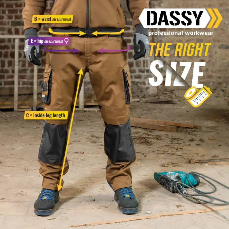Die meisten DASSY-Arbeitshosen sind in 3 verschiedenen Schrittlängen verfügbar: Standard, Plus (lang) und Minus (kurz). Dank eines besonderen ‘Doppelfinishs’ können die Hosenbeine auch problemlos um 5 cm verlängert werden.